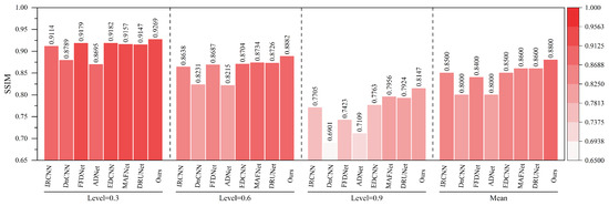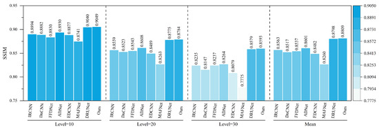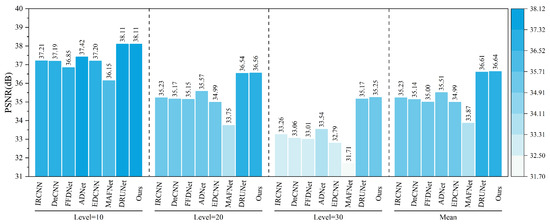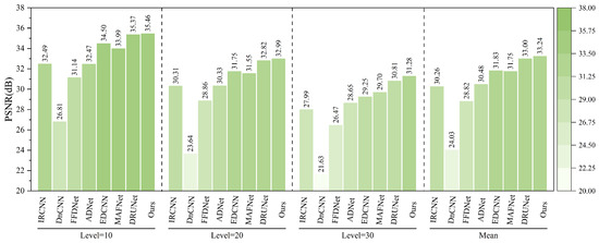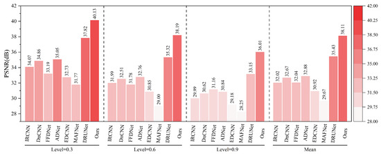 Figure 14, where the level represents the sigma value of Gaussian white noise and the density level of salt and pepper noise. From the figures, it can be seen that the average PSNR of MAFNet is 2.77 lower than the proposed algorithm, which can be attributed to the fact that although its network adopts a multi-scale training method, it does not effectively fuse feature information of different scales. The average PSNR of IRCNN, DNCNN, FFDNet, and ADNet achieved better results compared with MAFNet but were 1.41 dB, 1.50 dB, 1.64 dB, and 1.13 dB lower than the NAF-MEEF algorithm, respectively. The average SSIM was 0.0246, 0.0292, 0.0272, and 0.0208 lower, which may be due to their relatively simple structure and shallow network layers, making it difficult to achieve high performance. There is still a lot of room for improvement in denoising quality in this complex, high-noise environment. DRUNet benefits from its combination of UNet and ResNet advantages, which can handle more complex noise. However, the PSNR and SSIM values of the method proposed in this paper are improved by 0.08 dB and 0.0014 in high-noise environments (level = 30). In summary, the proposed algorithm has good denoising effects in both visual subjective perception and image denoising and restoration approximation degree.