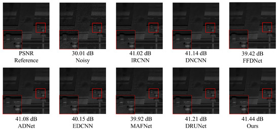 Figure 15 shows the images selected from the test set that contain a large number of components. This type of image has complex textures and rich high-frequency information, which helps to reflect the denoising effect of different algorithms and their ability to preserve structural information. From the figure, it can be seen that MAFNet and FFDNet exhibit severe smearing of component positions in the denoised image and poor detail preservation in low-light conditions. In contrast, methods such as DnCNN, ADNet, DRUNet, and EDCNN perform better in detail restoration, but in locally enlarged images, the presentation of details still appears cluttered and fails to fully capture texture features. Compared with the above methods, the method proposed in this paper achieves a good denoising effect while more effectively preserving edge information.