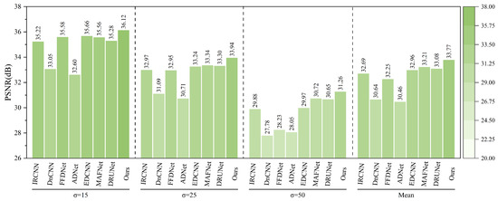At the low noise level (), the proposed method achieves the highest PSNR of 36.12 dB, outperforming the second-best method, FFDNet (35.58 dB), and IRCNN (35.22 dB). As the noise level increases to and , the proposed method maintains superior performance with PSNRs of 33.94 dB and 31.26 dB, respectively. Notably, under the highest noise level (), it still surpasses DRUNet (30.65 dB) and MAFNet (30.72 dB), demonstrating strong robustness.