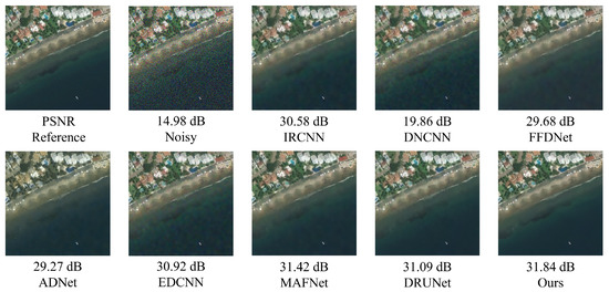 Figure 21, when Gaussian noise with a standard deviation of 50 is added, most compared methods exhibit over-smoothing or texture degradation, particularly around coastline edges and building structures. In contrast, the proposed method effectively removes the noise while preserving key semantic regions and structural details. The recovered coastlines appear sharp, building boundaries are well preserved, and the water surface is free from noticeable distortion, resulting in superior visual quality.