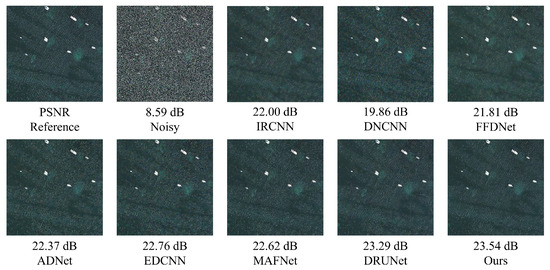 Figure 22, composite noise leads to severe degradation in visual quality, especially around the sea surface and small vessels, where heavy granular artifacts and structural blurring are observed. The denoising results of DnCNN and FFDNet remain suboptimal, with noticeable residual noise and blurred object boundaries. Although deep models such as DRUNet demonstrate improved edge preservation, they still suffer from texture degradation and slight artifacts. In contrast, the proposed method not only effectively suppresses various noise types but also preserves the original structural information of the image. The restored sea surface appears natural, and the contours of the ships are sharp and clear, demonstrating excellent visual fidelity.