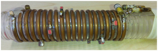 The solenoid, built on a plexiglass cylindrical support (Figure 2), was tuned at 127.75 MHz and matched to 50 Ω using fixed (ATC 100C—American Technical Ceramics, Huntington Station, NY, USA) and variable (AP40HV Voltronics, Chicago, IL, USA) capacitors, as detailed in [2].