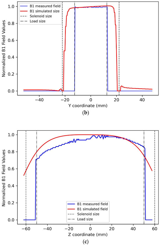 Simulated B1 magnetic field profiles obtained for the 1H solenoid and measured B1 field profiles extracted from phantom images along the x (a), y (b), and z (c) axes. B1 fields were normalized to their values at the solenoid center.