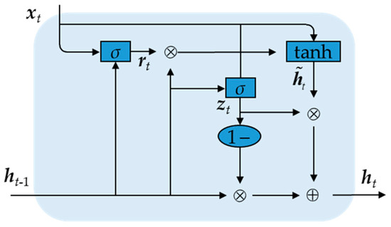 The basic structure of the GRU is shown in Figure 1. The GRU has an update gate and a reset gate . The update gate determines how much of the current hidden state of the time step should be inherited from the previous moment; the reset gate decides how much the current input affects the current hidden state [35]. Through these casting mechanisms, the GRU can better capture long-term dependence and avoid gradient loss or gradient explosion [36,37].