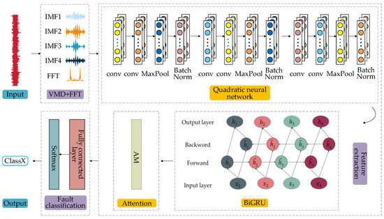 In this paper, a bearing fault diagnosis model VMD/FFT-Quadratic-BiGRU (VFQB) is proposed, as shown in Figure 3, which consists of three main parts: preprocessing, feature extraction, and fault classification.