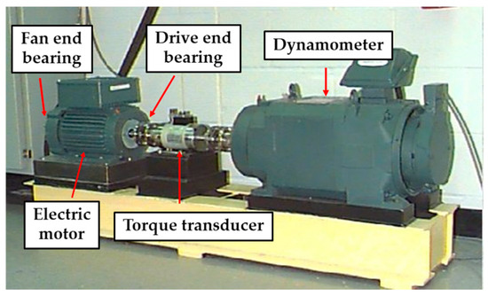 The data for Experiment 1 were obtained from the Case Western Reserve University (Cleveland, OH, USA) bearing fault dataset. The experimental setup used for data collection is depicted in Figure 4, which includes a motor, torque transducer, fan end bearing, drive end bearing, and dynamometer. The dataset corresponds to a rolling bearing at the drive end, with a motor speed of 1797 rpm, a load of 0 hp, and a sampling frequency of 12 kHz. The specific details of the data are provided in Table 1. This dataset includes both the healthy operating state and three primary failure scenarios: inner ring failure, outer ring failure, and ball failure. For each failure type, various damage levels were considered: 0.1778 mm, 0.3556 mm, and 0.5334 mm, resulting in a total of 10 distinct failure states for analysis.
