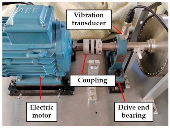The data for Experiment 2 were obtained from laboratory equipment. The experiment table consists of a motor, coupling, drive end bearing, vibration transducer, etc., as shown in Figure 5. This experiment covers six operating conditions: normal operating condition, inner ring failure, outer ring failure, ball failure, cage failure, and combined failure. The operating speed of the bearing is set to 1250 r/min and the load is set to 0 hp; the sampling frequency is 11 kHz, and 16,384 data are collected for each operating condition. The dataset is shown in Table 2.