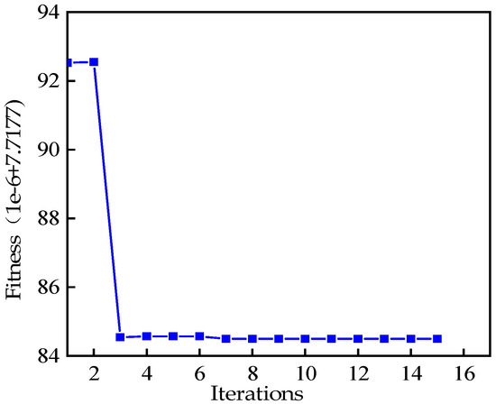 The performance of the VMD depends on the selection of key parameters such as the penalty factor α and the modal number K. Inappropriate parameters may lead to signal decomposition distortion or modes mix. We introduce the grey wolf optimizer (GWO) algorithm to optimize the VMD parameters to improve the quality of decomposition and the accuracy of signal analysis. The search range of VMD parameters is set , ; the grey wolf population is set to 20 and the number of iterations is set to 15; the envelope entropy is chosen as the fitness calculation. Figure 6 shows the optimization process of the GWO algorithm with the minimum fitness corresponding to the [K, α] combination of [4, 563].