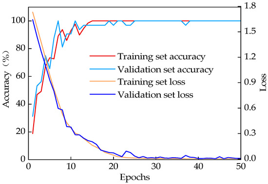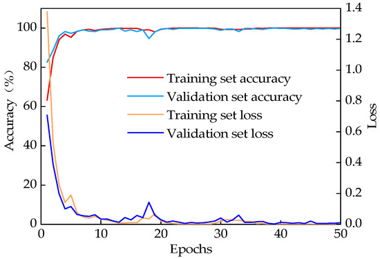 The model’s accuracy curve and loss value curves for Experiments 1 and 2 are shown in Figure 7 and Figure 8, following 50 epochs of training. The beginning of training is marked by a low accuracy rate and a high loss value. Increased iterations lead to a gradual increase in accuracy and a stable loss value, indicating that the model is slowly fitting the training data. Furthermore, the high consistency between the training curve and the validation curve suggests that there has been no fitting in the model.