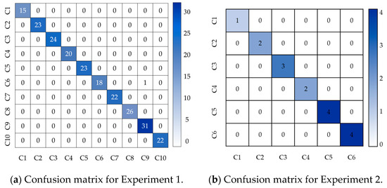 To further visualize the recognition accuracy across different categories in the two experiments, Figure 9 presents the confusion matrix for bearing fault state recognition results. In Figure 9a, the horizontal and vertical axes, labeled C1 to C10, represent the 10 bearing states in Experiment 1, including one normal state and nine fault states. In Figure 9b, the axes labeled C1 to C6 represent the six bearing states in Experiment 2, which include one normal state and five fault states. The diagonal values of each matrix indicate the number of samples in which the model correctly recognized each state.