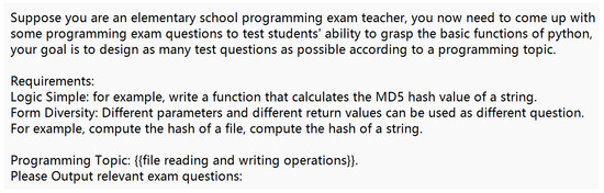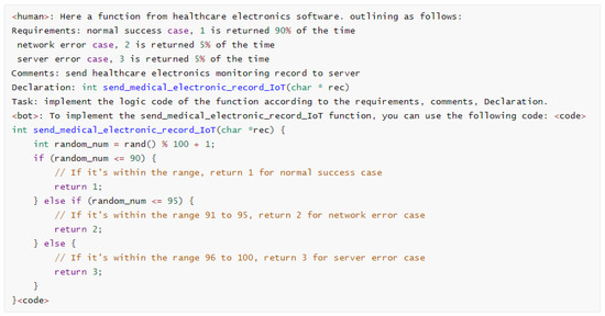 The prompt template consists of the bootstrap, modeling requirements, function comments, function declarations, and question and answer, as shown in Figure 6. In the prompt template, the API declaration section is the most important and mandatory; this is the minimum requirement for automation. The requirement section is from the content reference enumeration or the API interface description document. The other sections consist of fixed words to bootstrap NLP inferences. Consequently, in order to extract Python codes from LLM responses, the response source code is enclosed within the special token ‘<code>’.