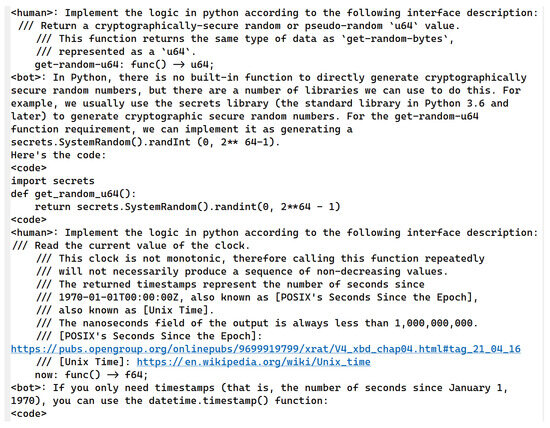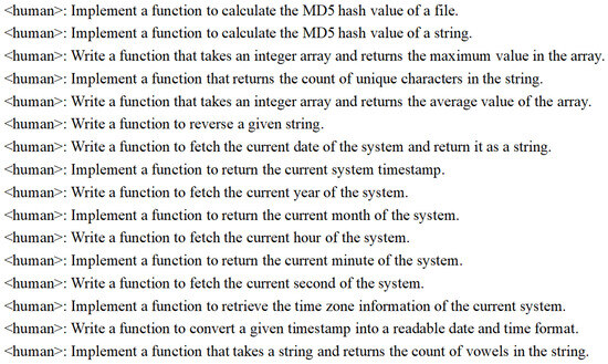 In conclusion, we prepared four different levels of training instruction templates to generate the training datasets. In general, the function declarations of system APIs and common SDKs and their APIs already contain rich function information to build functional logic code, although there are differences in different operating systems and programming languages. Through experiments, it is shown that such differences can be fully understood by the GPT-NeoX model. Therefore, our experiment prepares the end-to-end training corpus according to the declaration of the functional model to reduce the workload of manual intervention as much as possible. The second training instruction template is based on function description and function declaration. Most unknown functions are difficult to process uniformly, mainly because the data exchange and communication interfaces between information systems are self-defined. This part of the self-defined API usually has interface documents describing the input and output of related API interfaces. The third training instruction template is based on the user’s special requirements and function declarations. To obtain the system time, for example, if there are no special requirements, the model will output the current time of the system. If the software function is to determine the past or future time, then the current time of the system cannot trigger the corresponding logical conditions, resulting in incomplete coverage of software vulnerability detection. So specific requirements are added to the function declaration to achieve the goal, such as the system time returning a certain range of values. The fourth instruction training template combines requirements, comments, and declarations. The training instruction templates are shown in Table 2.