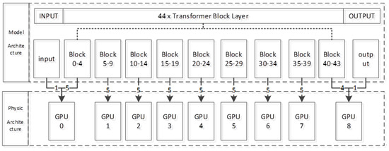 Pretrained model: GPT-NeoX-20B serves as the base model, a simple question–answer prompt template for constructing the unknown function model is designed to train the LLM. The original trained architecture of GPT-NeoX-20B requires the resources of 96 GPUs, each equipped with 80 gigabytes of memory. Due to hardware constraints, the existing equipment cannot support the continuous training of this model. Our study reduces the training architecture to 9 GPUs with 48 gigabytes of memory. Through pipeline parallelism, the 44 Transformer block layers of the pre-trained model are evenly split into 9 GPUs, and each GPU loads 5 block layers. Since 44/9 cannot be calculated as an integer, the ninth GPU8 only loads the last four block layers of the model, and the input layer and output layer are loaded to the beginning GPU0 and the last GPU8, respectively, to construct the topology of the entire trained model, as shown in Figure 5.