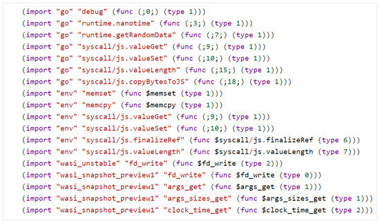 Symbolic execution engine: Manticore is a symbolic execution tool written in Python, based on SMT2 specification, and supporting Z3, Yices, and CVC4 solvers. So far, Manticore is one of the WebAssembly symbolic execution engines that implements basic symbolic execution of the WebAssembly minimum unit of the operation module. A common WebAssembly program as illustrated in Figure 7. It is clear that different compilations import various external functions, even if these functions have the same name or functionality and belong to the same environment namespaces. Let us take Emscripten as an example. When compiling to WebAssembly programs, ‘syscall/js’ is automatically included, which forces the runtime to either be a browser (Firefox, Chrome, etc), or at least pretend to be one. The APIs in packages such as go, env, wasi_unstable, and wasi_snapshot_preview1 are unknown functions. Therefore, the APIs in the import section of WebAssembly reveal that vulnerability verification has to set up a corresponding runtime environment, otherwise, vulnerability verification cannot be performed.
