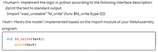 In this section, we present the entire implementation process, which encompasses numerous detailed steps. The key steps to be aware of in this process are explained in this section. First, let us take a look at the framework as a whole. The whole process is divided into data preparation, model training, and model application. In the data preparation phase, our goal is to obtain the Q&A corpus, and the simplest input is a function definition as the human part of the human–bot Q&A pair. The ‘bot’ outputs Python implementation codes for functions. In order to generate the corpus of the ‘human’ part, we first need to collect the API categories in Table 1. We use prompt text to enable LLMs to simulate the role of an interviewed programmer, following the prompt to implement the function. The LLM answers the code implementations. In fact, the preparation is a very complex process, and most of the data are synthesized by machines. For example, the official WebAssembly organization provides interface specifications and definitions for clarity. We synthesized a human–bot question–answering pair corpus. In this preparation process, we also make use of common LLMs to assist us in our work. In the model training phase, GPT-NeoX is modified to fit our hardware. Finally, when the model was applied, it was embedded in one of our previous works to verify the feasibility of the method. A detailed description will be given in a later section.