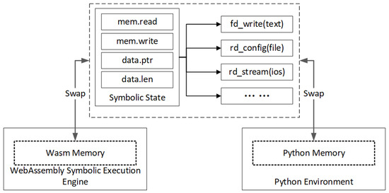 Memory: In our experimental task, our approach must deal with the memory swap problem of symbolic execution. WebAssembly defines a linear, contiguous memory model, allowing WebAssembly modules to utilize a contiguous block of memory. This memory space can be allocated by the host environment and accessed through the memory object of the WebAssembly instance (WebAssembly.Memory). WebAssembly modules can share memory with the host environment. For example, in web browsers, WebAssembly modules can share memory space with JavaScript code, enabling efficient data exchange. This shared memory mechanism is facilitated through the memory object of the WebAssembly instance. Certainly, memory access in WebAssembly is subject to strict bounds and type checking. Memory accesses in WebAssembly modules must be within the linear memory range, and out-of-bound accesses result in runtime errors. This design helps to ensure that the memory accesses in the WebAssembly modules are safe, thereby enhancing the system’s security and stability. The architecture of the symbolic execution engine reveals the internal relationship between the WebAssembly and Python environment as shown in Figure 9.