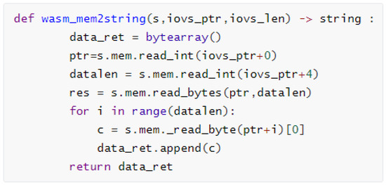 In other words, WebAssembly’s memory isolation prevents external environments, including our Python programs, from directly accessing the memory of an unknown function model. WebAssembly provides the mem-related methods of the symbolic state and then interacts with the outside world. For example, our model implements the ‘wasi_unstable’ function illustrated in Figure 8; the parameter ‘text’ of the ‘fd_write’ function is actually in the ‘mem’ object of the symbolic state. Our approach designs a simple symbolic execution memory swap management between WebAssembly and Python environment, illustrated in Figure 10.