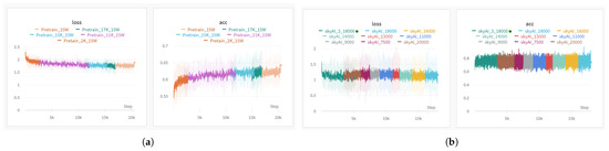 Next, we briefly introduce our model training experiment. The training script is executed on a system with an Nvidia RTX 8000 GPU with 48 GB (NVIDIA, Santa Clara, CA, USA) of memory, a dual Intel E2640 CPU (Intel, Santa Clara, CA, USA), running Ubuntu 22, and equipped with a 7 TB SSD hard disk. The hyperparameter configuration for the model includes a sequence input length of 2048, a dictionary token size of 50,432, a pipeline parallelization size of 9, an embedding size of 6144, a Transformer block layer of 44, a micro-batch size of 18, a gradient accumulation step of 4, and a warm-up step of 128. Our model training involves three stages. For the first stage, we use a unified language learning recovery training method that substantially improves existing language models and their scaling curves with a relatively tiny amount of extra computation, to enhance the generalization of the model. When the training result demonstrated in Figure 11a, the loss value is around 1.78 and the accuracy is 61.92%, the model moves on to the next training stage. The second stage involves training one sample at a time with left padding. The loss calculation for each step employs a full-context approach, allowing the model to gain a comprehensive understanding of semantics. As illustrated in Figure 11b, the model exhibits training accuracy stabilization at approximately 80%. During the final stage of training, we exclusively computed the loss for the response context to enhance the ultimate accuracy of the generated outcomes. Validation accuracy is shown in Figure 12. The whole training process is monitored by the W&B tool; the stages show multiple training sessions with different colors, which are checkpoints saved to test the actual effect of the model.
