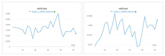 The loss and accuracy of the third stage of training; the valid accuracy achieves 99.8%.