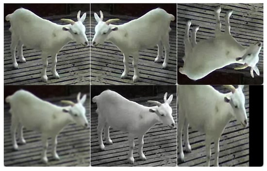 The sheep dataset used in this study was provided by Zhejiang Saino Ecological Agriculture Co., Ltd., located in Yiyi Village, Yiqian Town, Lin’an District, Hangzhou, Zhejiang Province. The farm covers an area of over 15,000 square meters and currently houses more than 12,000 sheep. Figure 1 illustrates the overall layout of the farm. The experiment was conducted in a separate shed, with the camera installed at the entrance of the sheep pen to observe and record the sheep’s behavior from this vantage point. The data collection period spanned from 15 June 2024, to 15 August 2024. A single RGB camera with a resolution of 2560 × 1440 pixels was used for filming. After data collection, clear and representative frames were manually selected from the recorded videos. Based on the original 1476 images, a series of data augmentation operations—including flipping, cropping, noise addition, and other transformations—were applied to enhance the diversity and robustness of the dataset. Figure 2 demonstrates various data augmentation operations employed in this study. These operations aim to simulate real-world variations in illumination, occlusion, and spatial configurations, thereby improving the generalization capability of the model during training. The LabelMe annotation tool was then used to label the positions and behaviors of the sheep. The dataset was divided into training, validation, and test sets in the following manner: 10% of the data was set aside as the test set, while the remaining 90% was split into an 80% training set and a 20% validation set.