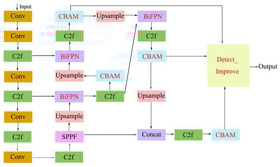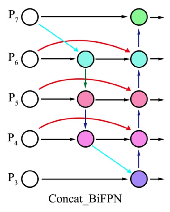 Given that input features at different resolutions typically contribute unequally to output features, BiFPN addresses this issue by incorporating learnable weights for each input, enabling the network to adaptively assign appropriate importance levels to distinct feature maps. To ensure that each value is non-negative ( ≥ 0), a rectified linear unit activation function is applied after each . The final BiFPN integrates bidirectional cross-scale connections and fast normalized fusion. As a specific example, the two fused features in the fourth layer are described by Equations (1) and (2). In the formulation, denotes the intermediate feature within the top-down pathway at Level 4. represents the learnable weight parameter, while corresponds to the input feature of Level 4. * represents convolution operations. indicates the resized feature derived from Level 5’s input through up-sampling or down-sampling to match Level 4’s resolution. is a minimal constant (e.g., 0.0001) introduced to prevent division by zero and ensure numerical stability. The final output feature of Level 4 is designated as .