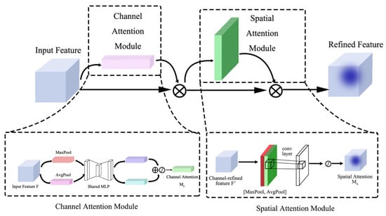 Attention mechanism: The attention mechanism mimics the attention principles in the human visual system by assigning differential weights to different pieces of information in the input data. This allows the model to focus on the most important parts of the input, thereby enhancing its performance and generalization ability. Specifically, in this study, we adopt the convolutional block attention module (CBAM []), which takes intermediate feature maps as input and sequentially derives a one-dimensional channel attention map and a two-dimensional spatial attention map , as illustrated in Figure 5. The CBAM module first applies the channel attention module to weight the feature responses of different channels, enhancing the channels that contain more semantic information in the feature map. Then, the spatial attention module further focuses on important spatial locations within the feature map, highlighting regions with high significance. The design of CBAM allows it to function as a plug-and-play module, easily integrated into existing convolutional neural network (CNN) architectures and trained end-to-end alongside the base network. By applying the attention mechanism sequentially in both the channel and spatial dimensions, CBAM effectively enhances the model’s ability to perceive key features, improving performance across various vision tasks. The overall attention process can be summarized as follows: