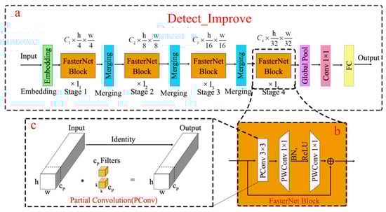The FasterNet architecture is designed around PConv and PWConv. It comprises four hierarchical stages. Prior to each stage, an embedding layer (employing a 4 × 4 convolution with stride 4 for initial feature extraction) or a merging layer (using a 2 × 2 convolution with stride 2 for down-sampling and channel expansion between stages) is applied to perform spatial down-sampling and channel scaling. Each FasterNet block contains a PConv layer followed by two PWConv layers. This design resembles an inverted residual block, where the intermediate layer expands the channel count and reuses input features via a shortcut connection. To preserve feature diversity while minimizing latency, normalization and activation layers are applied only after the intermediate PWConv layer within each block. The final three layers of FasterNet include global average pooling, a 1 × 1 convolution, and a fully connected layer for feature transformation and classification. Our enhanced version of FasterNet maintains computational efficiency while significantly improving object detection accuracy and robustness, particularly excelling in handling occlusions and multi-scale targets. The introduced techniques effectively reduce model parameters and computational complexity while enhancing detection precision. The computational workflow of the detection head is illustrated in Figure 6a, The Faster block framework is illustrated in Figure 6b, and the PConv framework is illustrated in Figure 6c.