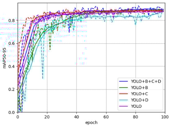 Figure 7 presents the comparison results of different optimized models in terms of mAP50 during the first 100 training iterations. All models exhibited a progressive improvement in mAP50 as training epochs increased, eventually reaching performance plateaus. This convergence pattern validates the effectiveness of the training process by demonstrating consistent performance stabilization across models. The model incorporating three stacked modules achieved the highest final mAP50 value, indicating that the synergistic combination of these modules significantly enhances model performance. These experimental results substantiate the efficacy of the proposed improvements.