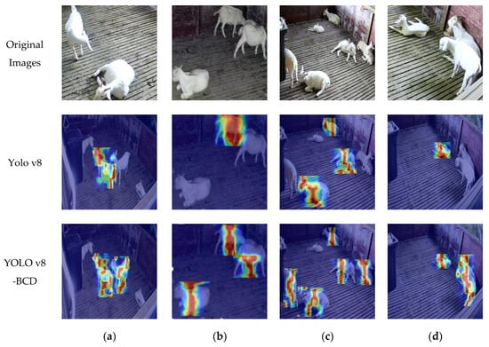 To better evaluate model adaptability from a visual perspective, we compare the heatmaps generated by YOLOv8 and YOLO v8-BCD, as illustrated in Figure 8, which highlights advancements in feature detection and localization precision. Heatmaps serve as an effective visualization tool, employing gradient color transitions to represent detection confidence, where cooler colors (such as blue or green) denote lower values and warmer colors (such as red or yellow) indicate higher values. As shown, compared to standard YOLOv8, the YOLO v8-BCD model demonstrates finer coverage and distribution of detection regions, with heightened intensity and clarity in regions of interest (ROIs). Notably, the YOLO v8-BCD model successfully identifies objects even in partially occluded areas. These enhancements indicate strengthened feature extraction capabilities and improved robustness in the detection process, resulting in outputs that align more precisely with the actual scenes depicted in the original images. Such advancements are particularly valuable for high-precision applications like livestock monitoring, where accurate object localization and segmentation are critical to operational success.