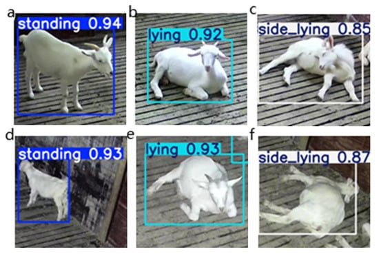 The actual performance of sheep during the day and at night when illuminated by cameras: (a–c) are daytime images and (d–f) are nighttime images.