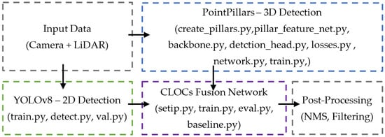 Figure 3 illustrates the overall architecture of the C2L3-Fusion framework, highlighting the interaction between 2D and 3D object detection components, fusion mechanisms, and post-processing techniques. This diagram provides a visual representation of the system’s modular approach to multi-modal data integration. The system processes data from two sensor sources, Camera and LiDAR, using two independent object detection models: YOLOv8 for 2D detection and PointPillars for 3D detection. A fusion neural network, CLOCs, then merges the outputs from these two models to enhance perception accuracy.
