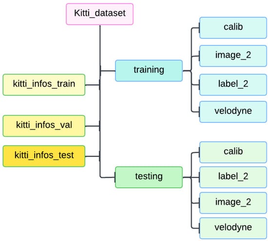 Structure of the KITTI dataset, showing the organization of training and testing data, including RGB images, point clouds, and labels.