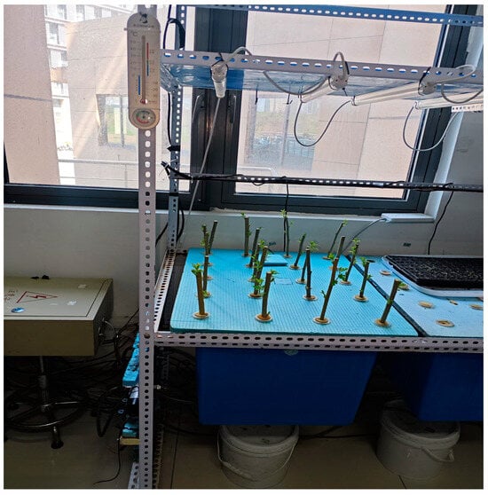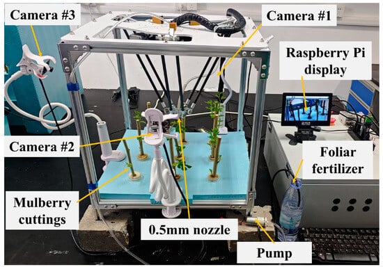 An experiment exploring the fogging cultivation of mulberry cuttings was conducted in the fogging laboratory at Jiangsu University. Healthy, pest-free cuttings with strong vitality and new shoots were selected. From these, 15–18 cm branches bearing 2–4 shoots were carefully cut. The mulberry cuttings were sterilized with a potassium permanganate solution for 30 min, and after sterilization, they were rinsed with water and dried. Then, the cuttings were soaked in a rooting solution for 2 h and transferred to a mist incubator. The fog box was an HDPE box with dimensions of 740 mm (length) × 535 mm (width) × 415 mm (height). We used a piece of foam board with dimensions of 730 mm (length) × 525 mm (width) × 10 mm (height) as a colonization plate to place on the fog box. Twenty holes with a diameter of 34 mm were drilled at intervals of 14 cm by 14 cm as planting holes, and planting baskets with an inner diameter of 32 mm and an outer diameter of 45 mm were placed inside the planting holes. A sponge with a hole in the center was placed inside a planting basket, a mulberry cutting was placed in the sponge, and the lower part of the mulberry cutting was suspended inside the fog cultivation box through the hole at the top of the planting basket. A schematic diagram of the fog incubator is shown in Figure 1. Four nozzles were mounted at the bottom of the fog cultivation tank, and the four nozzles were connected to a water pump (PLD-1206, 12 V, 3.5 A, 4 L/min) through a PU air hose. In the first week, fresh water (tap water) was employed in the fog culture system, and in the second week, the fresh water was replaced with the soilless nutrient solution (inorganic fertilizer solution) A and B from the Air Garden brand. This nutrient solution, mixed with fresh water at a ratio of 1:400 by volume, was used to spray the mulberry cuttings. The water pump (PLD-1206, 12 V, 3.5 A, 4 L/min) was made via a Raspberry Pi to spray the nutrient solution for 2 min every 2 h. After spraying the nutrient solution for 8–10 days, the shoots of the mulberry tree cuttings gradually began to grow new leaves. However, some branches showed delayed growth and required a longer period to develop. A solution of potassium dihydrogen phosphate with a mass fraction of 0.4% was prepared as a mulberry foliar fertilizer solution, and the mulberry cuttings were put into the developed mulberry foliar fertilizer intelligent spraying system. After the intelligent spraying system identified and located a slow-growing mulberry cutting, the robotic arm moved the 0.5 mm nozzle to 30 mm above the slow-growing mulberry cutting and then turned on the micro-peristaltic pump (5 V, 1 A, 1.5–3.2 L/min) to spray the foliar fertilizer solution for 20 s, controlled using a Python program.