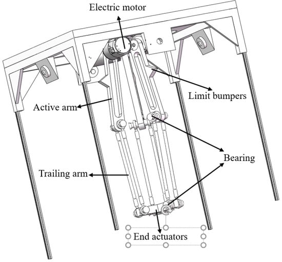 The parallel robotic arm in Figure 4 comprises several key components: The electric motor receives and converts control signals from the motor driver to drive the active arm movement. Limit bumpers trigger the limit switch through physical contact when the robot arm reaches its limit position, ensuring the safety control of the movement range. The active arm, powered by the drive device, executes core motion commands and drives follower parts to perform precise tasks like positioning, gripping, and handling. The trailing arm transmits the movement and force from the active arm, assisting in precise positioning and stabilizing the end effector while enhancing the overall structural rigidity and coordination. Bearings support moving parts, reduce friction, and ensure flexible, high-precision relative motion between chains, maintaining stability and coordinated movement. Finally, end actuators make direct contact with the object, performing specific tasks such as grasping, processing, and inspection.