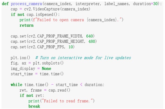 After completing the hardware design and developing the control system, the next step was to write the control program code to implement the system’s functionality. Below is a portion of the code along with its corresponding function description. Figure 6 shows the code for controlling the camera, which results in a 30 s real-time video stream being captured from a specified camera and each frame being processed in real time. Figure 7 displays the code for drawing bounding boxes around mulberry cutting species in the camera image.