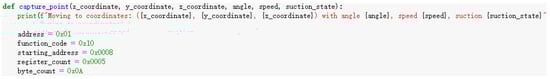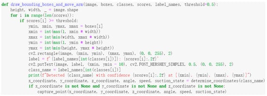 Figure 7 presents the code for drawing bounding boxes around detected targets and guiding the robotic arm to specified coordinates based on the target category. Figure 8 shows the code for generating Modbus protocol commands to move the robotic arm to the specified coordinates and execute the adsorption action.