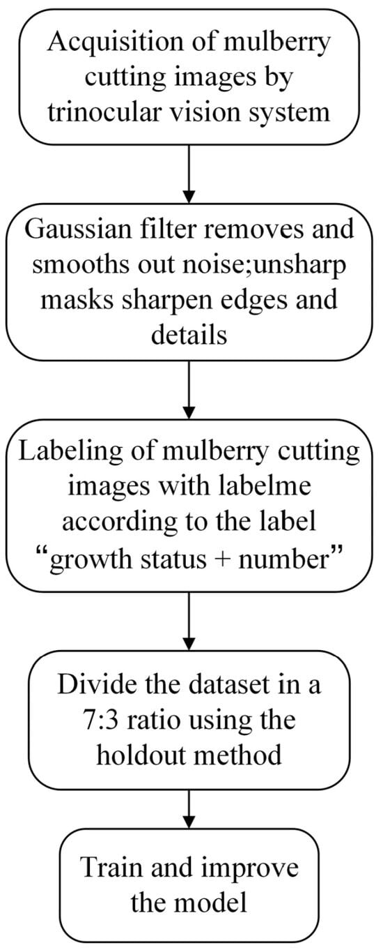 The holdout method was employed to split the dataset into a training set and a test set at a 7:3 ratio, enabling an accurate evaluation of the mulberry cutting recognition model’s performance. Specifically, 2100 images were allocated for training, while 900 images were reserved for testing.