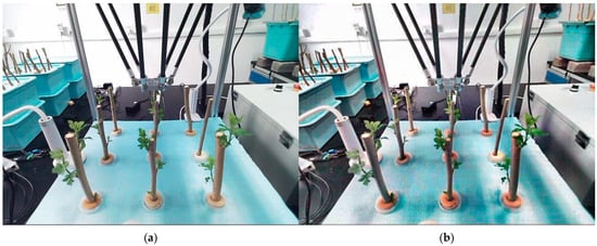 The parallel robotic arms are positioned within a cube frame with dimensions of 46 cm in length, width, and height. The origin of the robotic arm’s coordinate system lies along the same line as the center points of the upper and lower square frames. A three-dimensional model of the parallel robotic arm is shown in Figure 4. After the slow-growing mulberry cuttings are identified and located, the sprinkler on the end effector is made to move above the corresponding cuttings, and the micro-peristaltic pumps are activated to spray foliar fertilizer.