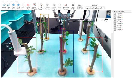 The classification of slow and rapid growth was primarily based on the number of leaves, the total leaf area, and the frequency of dormancy periods being broken before growth resumed. Branches with larger characteristics were categorized as showing rapid growth, while others were classified as showing slow growth. In this study, Labelme, an open-source image annotation tool, was used to calibrate the captured mulberry tree cutting images. Normal-growing mulberry tree cuttings were labeled as “Rapid”, while slow-growing ones were labeled as “Slow”. The branches were labeled from #1 to #9, corresponding to their position relative to the robotic arm. The labeling tags combined the growth status and serial number of the mulberry cuttings in the format “growth status + serial number”, resulting in 18 label types: Rapid #1, Slow #1, Rapid #2, Slow #2, Rapid #3, Slow #3, Rapid #4, Slow #4, Rapid #5, Slow #5, Rapid #6, Slow #6, Rapid #7, Slow #7, Rapid #8, Slow #8, Rapid #9, and Slow #9. Figure 12 illustrates the process of picture calibration.