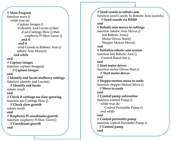 The control system of the robotic arm is based on a Raspberry Pi as the upper computer and the robotic arm control board as the lower computer, with communication between the two via RS485. The Raspberry Pi 4B handles the identification and location of slow-growing mulberry cuttings in an aeroponic system and transmits the coordinate information and control instructions to the lower computer via RS485 communication (Appendix A). The lower computer then controls 42 stepper motors using a DT5045 motor drive to move the robotic arm above the slow-growing mulberry cuttings. Finally, the Raspberry Pi activates a vacuum pump to spray a solution promoting the growth of the cuttings. The pseudocode for the entire system’s operation is shown in Figure 13.