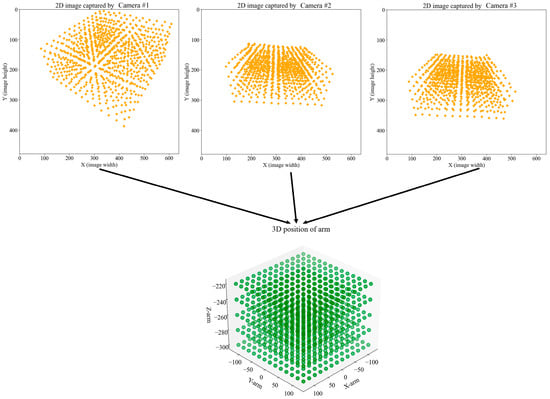 After moving the robotic arm to a specific position using the robotic arm control software, an image was captured by each of the three cameras arranged above it, forming a group of images. The position of the robotic arm was then adjusted, and the process was repeated. In total, 845 groups of images were collected. The X, Y, and Z coordinates of the robotic arm’s position were determined using the software, as shown in Table 2. The target position coordinates were obtained by permuting and combining the X, Y, and Z coordinates.