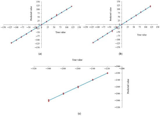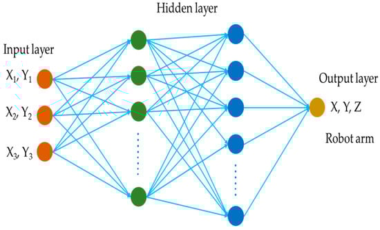 In the domain of robotic arm coordinate prediction, the Backpropagation Neural Network (BPNN) has emerged as a powerful computational tool. This model boasts a meticulously crafted architecture, comprising three distinct layers. The first layer, known as the input layer, serves as the primary data entry point. It processes the 2D coordinates of objects detected in images captured by multiple cameras, specifically X1, Y1, X2, Y2, X3, and Y3. This layer sets the stage for further data processing. The second layer, the hidden layer, acts as a bridge between the input and output layers. It plays a pivotal role in transforming the input data into a format that can be effectively utilized by the final layer. The output layer is where the predictions are generated. This layer took the processed data from the hidden layer and accurately determined the 3D positions of the robotic arm in motion, represented by the X, Y, and Z coordinates. The neural network model’s intricate structure, which precisely calculated the predicted coordinates of the robotic arm, is visually depicted in Figure 16. The model’s training process was equally sophisticated. It was configured to run for up to 500 iterations, utilizing the L-BFGS algorithm for weight optimization. To fine-tune the model’s performance, a rigorous hyperparameter tuning process was employed, leveraging 10-fold cross-validation. The inputs, X and Y coordinates extracted from images, were fed into the model. These inputs were processed using a variety of activation functions, including identity, logistic, tanh, and ReLU functions, to enhance the model’s learning capabilities. The number of neurons in the two hidden layers, denoted as nr1 and nr2, was systematically varied from 1 to 20. For each unique combination of parameters, the model underwent training, and the root mean square error (RMSE) was meticulously computed. The optimal configuration was identified by selecting the parameter set that yielded the lowest RMSE. Once the optimal configuration was determined, the BPNN model was retrained using the entire dataset. This comprehensive retraining ensured that the model was well equipped to handle unseen data, thereby ensuring its generalization performance. This step was crucial in ensuring that the model could reliably predict the robotic arm’s coordinates in real-world scenarios beyond the confines of the training data.