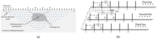 During the grouting process, the electrical properties of the slurry change the resistivity of the grouted area. This system utilizes the direct current method from geophysical techniques, using a specific array of electrodes placed on the surface, eliminating the need to bury any equipment. By measuring the voltage change during grouting, this system calculates the apparent resistivity and performs an inversion to evaluate the grouting diffusion. Although soil moisture content affects the background apparent resistivity values of the stratum, the diffusion of grout can still be effectively monitored by comparing the relative changes in apparent resistivity before and after grouting. The measurement principle is shown in Figure 1a, which indicates a profile measurement diagram of a measurement line. Electrodes are placed on the ground in the measurement area, some of which are connected to a power source for supplying electricity, while others are used to collect voltage data transmitted through the subsurface medium. By selecting different electrodes as power supply and measurement electrodes and adjusting the spacing between them, the depth and location of the detection point can be changed.