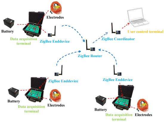 The structural composition is shown in Figure 2. The system is divided into three parts: user control unit, ZigBee wireless communication network, and data acquisition unit. The user control unit contains a computer and a ZigBee module, and a QT-based monitoring software is designed to control the data acquisition unit and receive the acquired data in real time. The ZigBee wireless communication network comprises a number of CC2530-based ZigBee modules for transmitting data and commands between the data acquisition unit and the computer. The user control unit acts as a coordinator node and the data acquisition unit works as an end-device node. The data acquisition unit consists of a data acquisition board, an electrode control board, and a ZigBee module for implementing measurement acquisition of the grouted area. Each data acquisition unit utilizes up to 60 electrode channels. It allows multiple data acquisition units to be controlled in real time by operating the control unit, or each data acquisition unit can also be operated independently.