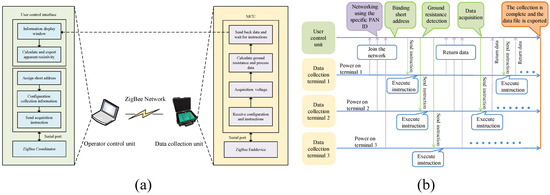 Figure 6 represents the functional architecture and interaction flow of the system at the software level. Figure 6a shows the software functional architecture of the proposed system according to the three modules: user control unit, data acquisition unit, and ZigBee network. In the control unit, a user control interface is designed, which contains an information display window for monitoring the acquisition data and information, and an acquisition setting area that allows the user to configure data acquisition parameters and send acquisition commands. In addition, the software assigns unique sequential numbers to the data acquisition units in joining the network to facilitate the differentiation of different data acquisition units. As shown in Figure 6b, by binding the sequence number to the short address of the acquisition unit, it is convenient for the user to manage the data acquisition unit through the sequence number. The ZigBee module program is responsible for creating and configuring the ZigBee network (e.g., channels and PANIDs), managing the multiple ZigBee nodes, and realizing the data transmission from the acquisition unit to the user’s control unit. The acquisition unit program performs acquisition operations, calculating and processing the acquired data based on the configured parameters. According to Figure 6b, the steps for the user to operate the system are as follows. First, the user control unit and the acquisition unit are turned on to establish the ZigBee network. The acquisition unit is recognized by the control interface after successful network connection and is assigned a number. Second, the acquisition settings are configured in the interface, the device number is entered to select the specified acquisition unit, and commands and settings are sent. Third, the acquisition unit collects and processes the data according to the configuration and transmits it back to the user control interface, where the user monitors the data in the information display window. Finally, the apparent resistivity can be calculated through the user control interface and exported for inverse analysis.