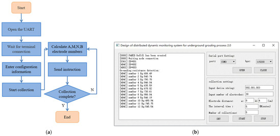 The PC operation interface of the operator control unit, designed using QT, is depicted in Figure 7b, with the operation process shown in Figure 7a. Upon launching the interface, the first step involves opening the serial port to enable data interaction with the ZigBee module. Subsequently, the user adds grouping information for the data collection unit, such as the number of electrodes, electrode spacing of a, and line spacing of d, based on the actual power-on sequence and wiring configuration. The user control unit, as designed in this article, allows setting the interval and frequency for continuous data collection. It automatically issues collection commands based on these settings, eliminating the need for manual repetition and thereby enhancing efficiency.