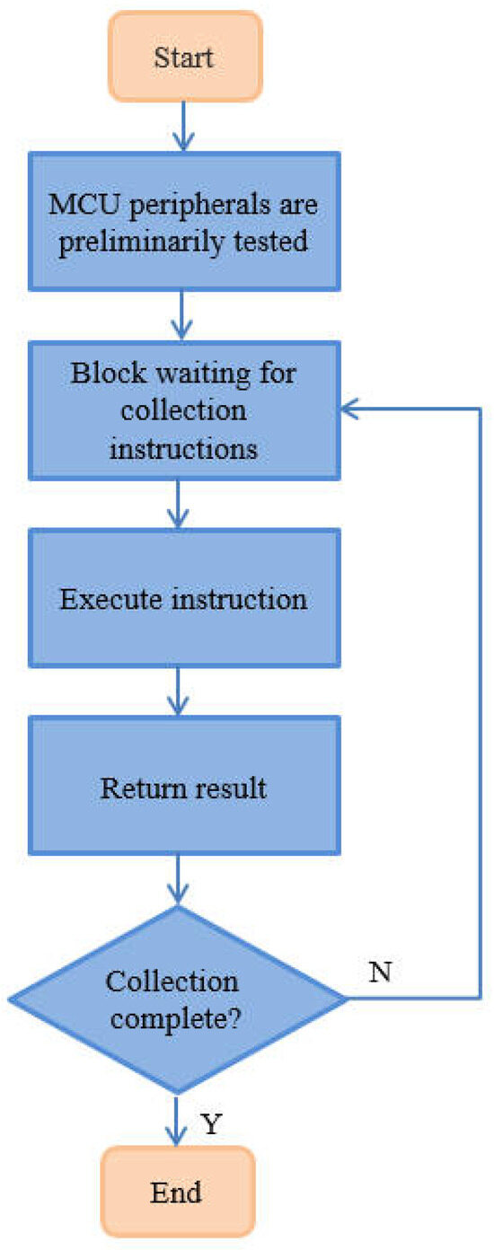 For the MCU of the data collection unit, the program flow is illustrated in Figure 8. After power on, STM32 initializes the IO, serial port, and other peripherals used. After receiving instructions, the following operations are mainly performed: