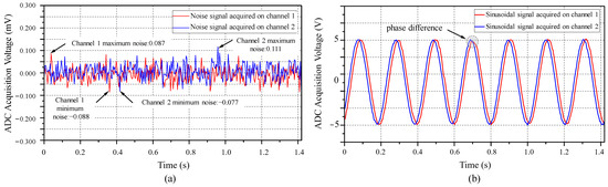 The accuracy of the voltage measurement of the data acquisition unit is crucial and directly affects the grouting detection effect. Therefore, the system acquisition performance needs to be tested. The input units of the two differential input channels of the ADS131E08 were short-circuited to obtain the channel noise as shown in Figure 10a. The ADS131E08 chip was set to a sampling rate of 1 kHz. In the experiment, 1400 data points were sampled for each channel, and by subtracting the maximum value from the minimum value, the equivalent input noise (EIN) was obtained as 175 μV for Channel 1 and 188 μV for Channel 2. A sine wave voltage with a peak-to-peak value of 10 V was input into the two channels, and the result is shown in Figure 10b, with a phase difference of 3.6° between the two channels. Compared with the generated standard sinusoidal waveform, the average errors of the sinusoidal waveform data collected by the channels were calculated to be, respectively, 0.004514 V and 0.00419 V. During data collection, the ADC device uses two channels: (the voltage of the acquisition channel) and (the voltage across the sampling resistor to obtain the discharge current). We performed SNR measurements on these two channels, which yielded results of 98.76 dB and 97.66 dB, respectively.