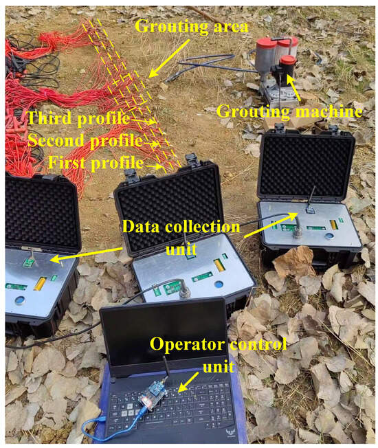 In order to test the actual functional effectiveness of the system, a grouted area was selected outdoors for monitoring experiments. The slurry injection area was a rectangular area of 40 cm length, 20 cm width, and 20 cm height, modified to simulate a pebble layer, resulting in a higher apparent resistivity than the surrounding area. When slurry is injected into the area, the low resistivity of the slurry causes the apparent resistivity of the area to decrease. The apparent resistivity of the injected region was monitored in real time by the system to verify the feasibility of the system for real-time monitoring of the spreading of the slurry and the effect of the slurry injection. The experimental setup includes an operation control unit, acquisition units, a grouting machine, electrodes, and measuring lines. The acquisition unit, equipped with a ZigBee node, facilitates wireless communication with the operation control unit. The measuring lines are arranged in the grouting area and the electrodes were connected to the measuring lines. The acquisition unit connects the measurement lines to control the electrodes and collect data. As shown in Figure 11, the arrangement consists of three measuring lines, each 4 cm apart. The electrodes are spaced 8 cm apart and are made of copper wire with a diameter of 1.78 mm. Each measuring line is connected to 30 electrodes. The second measuring line passes through the center of the grouting area. The center of the grouting area is approximately 1.25 m from the first electrode and 2.32 m from the last electrode. The grouting machine is used to perform the grouting at a pressure of 3.45 MPa and the grouting time is 20 min. The grouting material used is a cement-based slurry consisting of Ordinary Portland Cement, water, and graphite powder mixed in a ratio of 5:2.64:1. Cement is a typical low-resistivity grouting material, and the addition of graphite powder enhances the electrical conductivity and fluidity of the slurry, facilitating the measurement of electrical parameters.