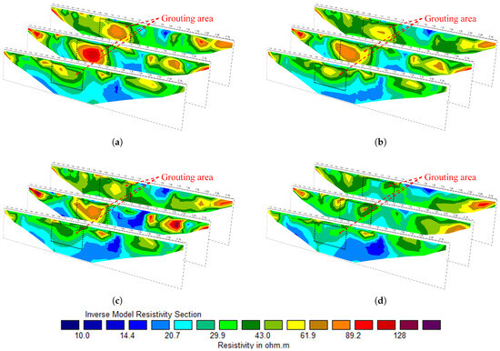 Actual inversion results. (a) Apparent resistivity distribution in the subsurface before grouting. (b) Apparent resistivity distribution after 5 min of grouting in the subsurface. (c) Apparent resistivity distribution after 10 min of grouting in the subsurface. (d) Apparent resistivity distribution 20 min after grouting.